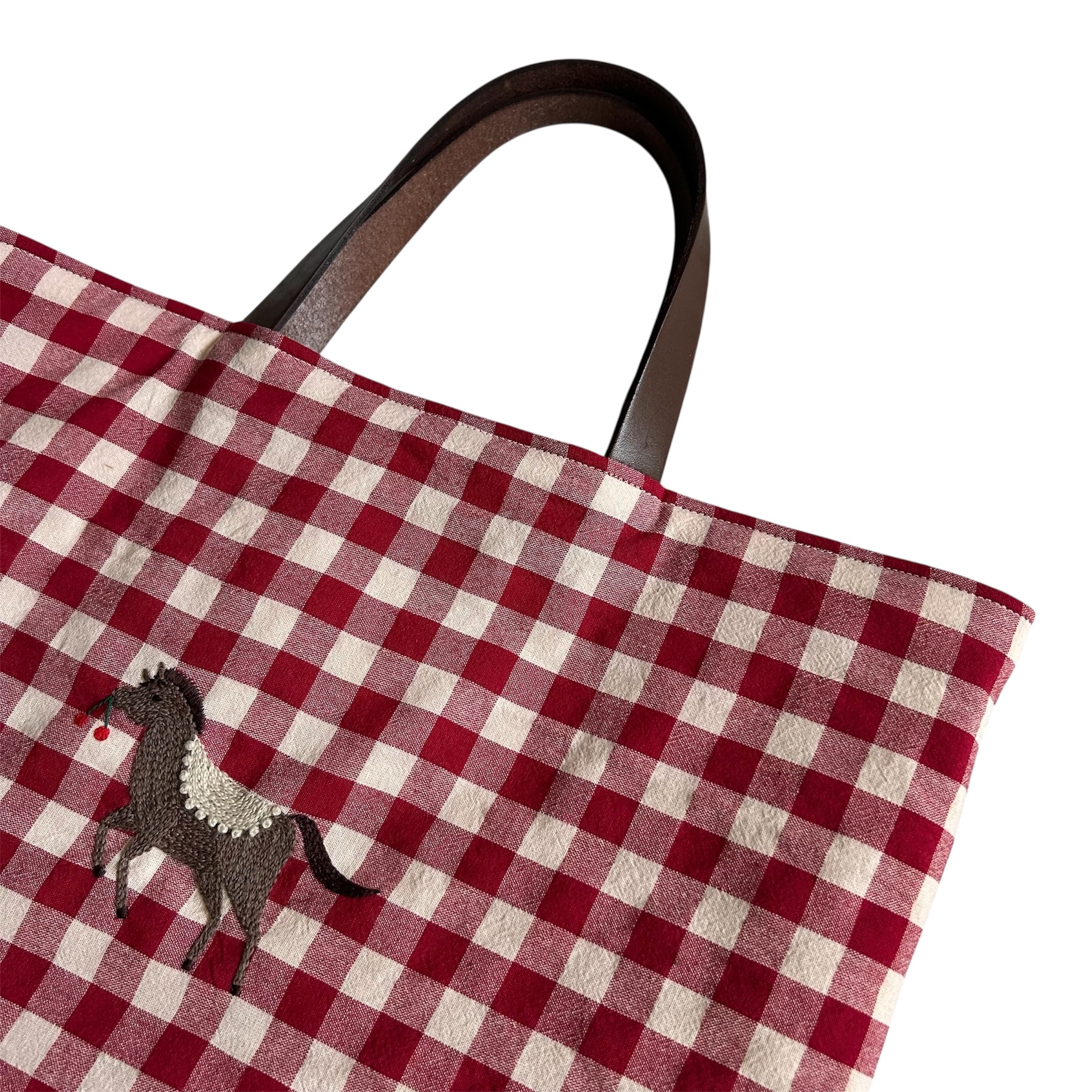 大きめのギンガムチェックが可愛いレッスンバッグです。内側には便利なポケット付きです。
