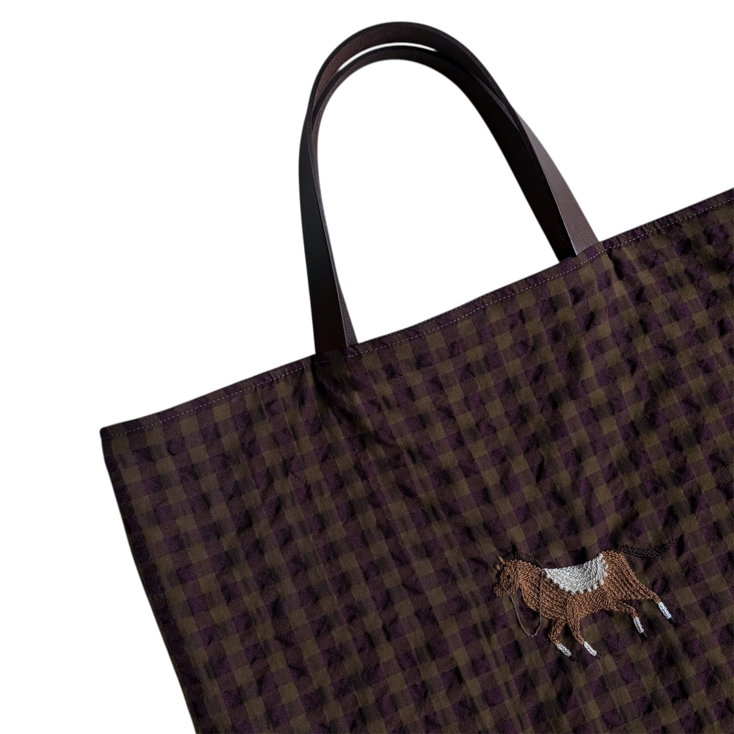 ギンガムチェックサッカー生地のポニートートバッグです。