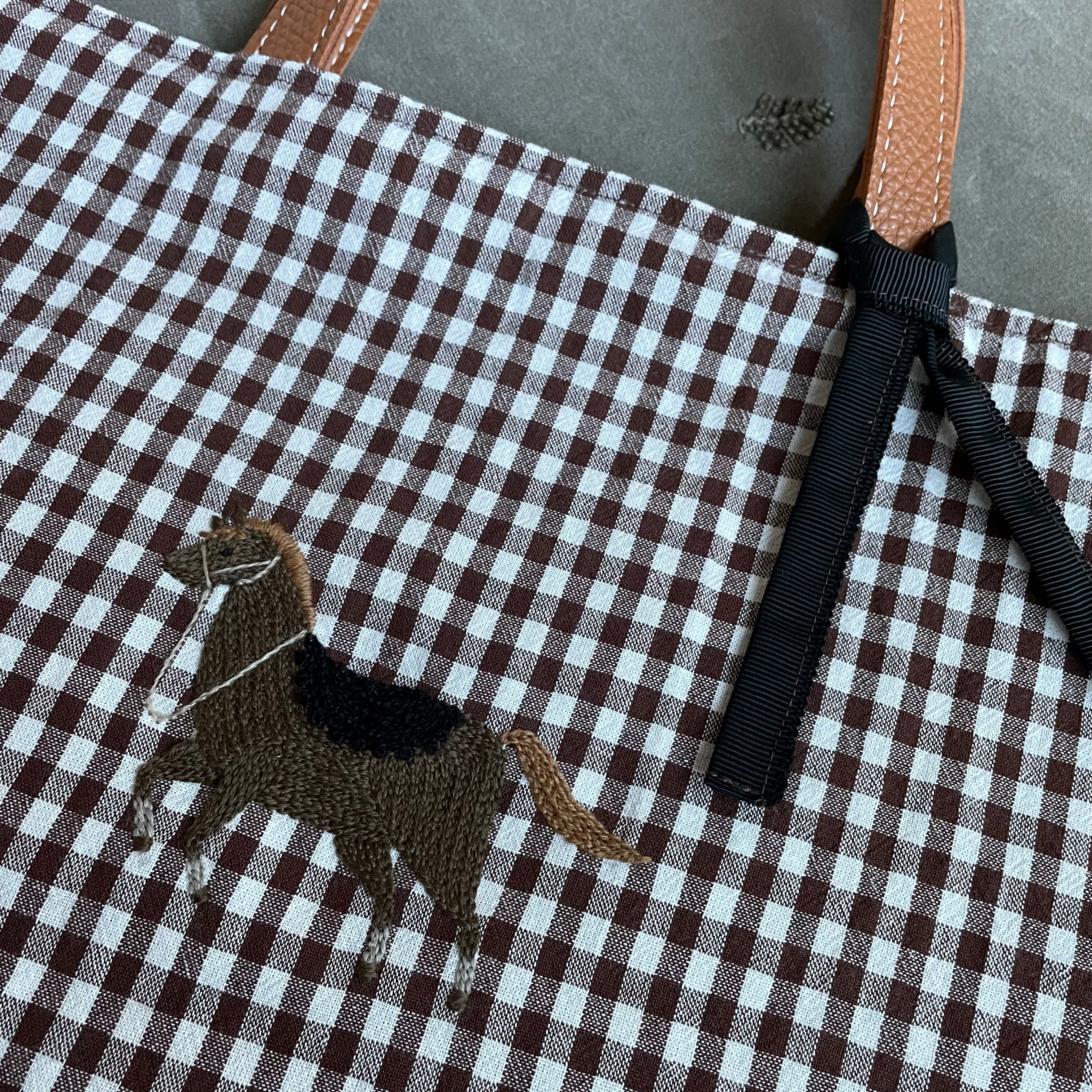 ポニーのレッスンバッグです。ブラウンチェックの布とポニーの相性がとても可愛いです♡