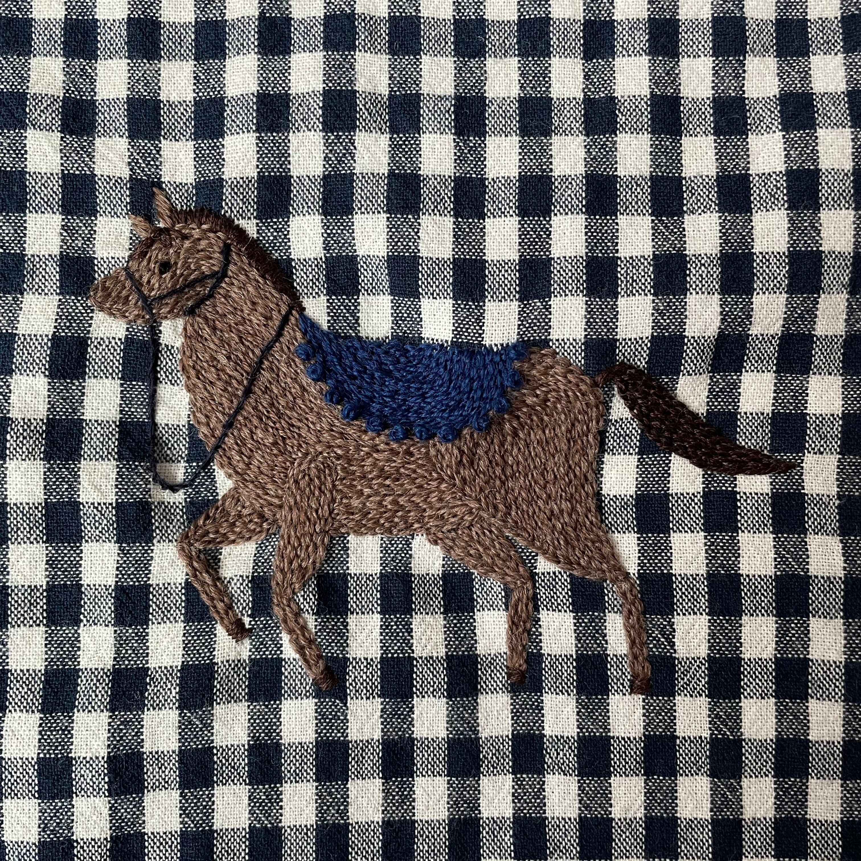 フリル付きのポニーレッスンバッグです。ブルーチェックの布とポニーの相性がとても可愛いです♡